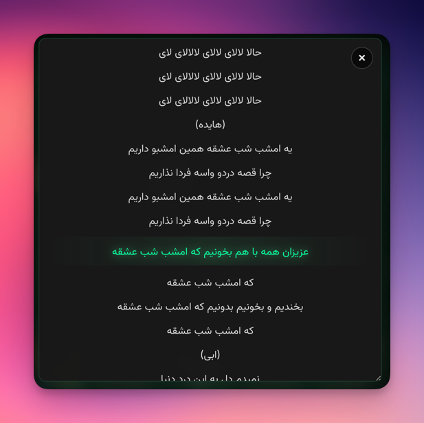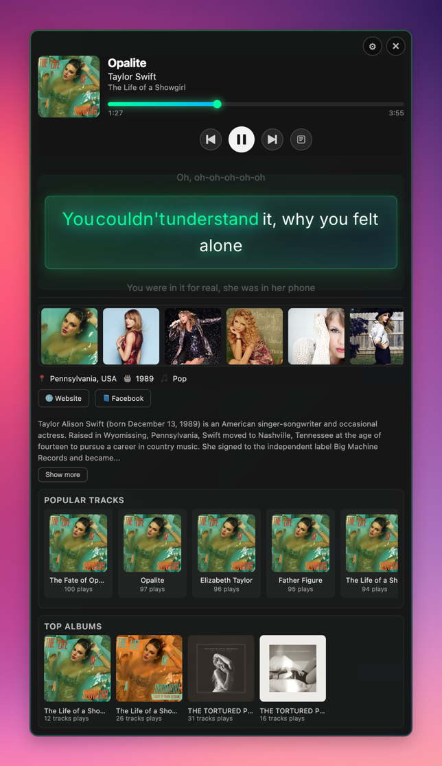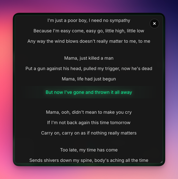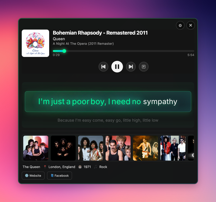 | **Core** - Real-time word-by-word highlighting - Auto-sync with playback position - Full lyrics modal view - Progress bar seek support | **Integrations** - Spotify, Apple Music, YouTube Music - Spotify OAuth for top tracks/albums - Menu bar live lyrics display - 7-day intelligent caching | **Design** - Apple Liquid Glass UI - Dark/light mode auto-switch - RTL support (Arabic, Persian, Hebrew) - Always-on-top floating window |
